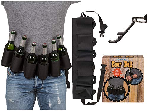In de toekomst hoef je nooit je drinkfles te zoeken en heb je je handen vrij voor andere activiteiten. De praktische bierflessenhouder als riem kun je heel eenvoudig om de heupen leggen. Hij kan in de lengte eenvoudig tot 124 cm worden versteld. De riem biedt plaats aan 6 flessen of blikjes. Bijzonder praktisch is ook de flesopener van metaal, die aan de bierriem is bevestigd. Het is ideaal als cadeau voor Vaderdag, vrijgezellenfeest of als praktisch gadget voor de volgende wandeling.