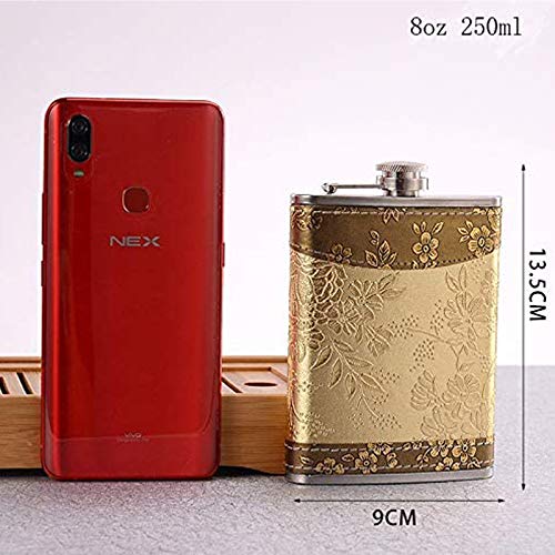 【Uiterlijk】 Rechthoekige vorm design heupfles met gouden bloemenpatroon en het oppervlak is zeer glad en zeer milieuvriendelijk het heeft een goede textuur om aan te raken, geven mensen een goede visuele ervaring.