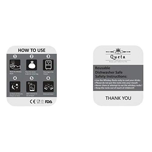 2. Koel de drank gemakkelijk af – je hoeft geen ijsblokjes toe te voegen om de beste smaak van de drank te krijgen. De 20 x 20 x 20 mm grote whisky-eistorte bestaat voor 100% uit smaakloze basalt. Ze smelten niet in het glas, waardoor de smaak van de drank 100% zuiver blijft. Laat de stenen enkele uren in de koelkast en gebruik ze na het verwijderen.
