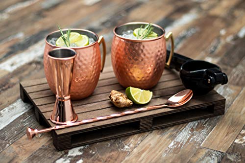 🍸 UITRUSTING: Met de Moscow Mule complete set zijn de populairste cocktails snel bereid met plezier en professionaliteit. De set bevat: 2 x Moscow Mule mokken in gepolijst glanzend gehamerd koper design (500ml), 1 x bar lepel in gepolijst koper, 1 x bar maat in gepolijst koper en 1 x limoen knijper in zwart.