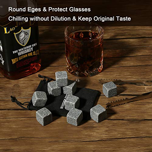 Whiskey Stones cadeauset | Set van 9 herbruikbare koelende whiskyrotsen met ijsklem, wijnflesschenker & opbergzakje…